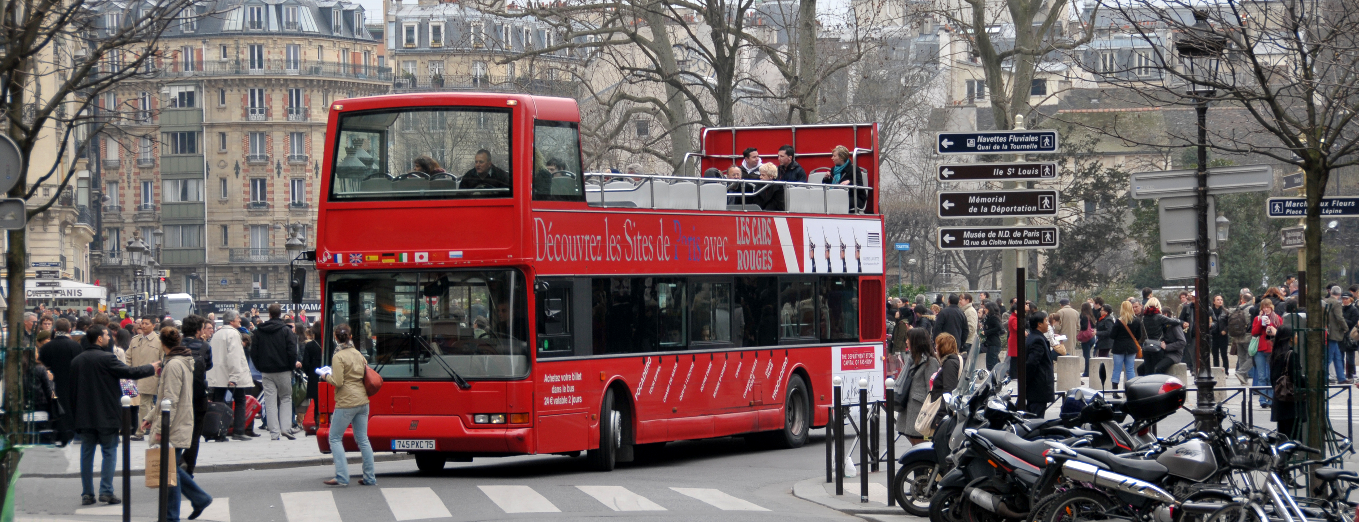 Для проведения экскурсий в Париже курсируют комфортабельные двухэтажные автобусы Hop-on Hop-off. Благодаря яркой расцветке они узнаваемы и заметны издалека.
